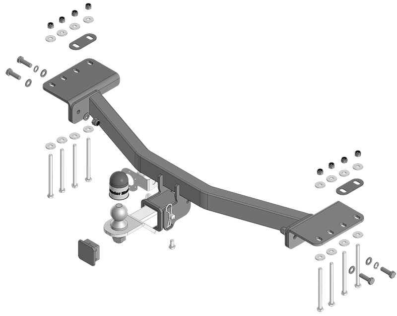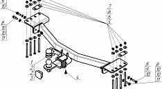 1. Отвернуть штатные болты крепления усилителя бампера и на их место прикрепить задние точки крепления кронштейнов ТСУ, используя болты М10х140 с шайбами и гр. шайбами 10.