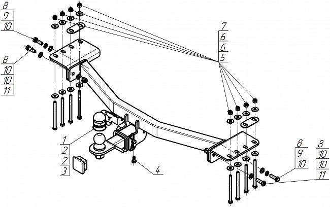5. Установить вставку с шаром, закрепить её пальцем при помощи шплинта, прикрепить её болтом М10х20 (либо установить заглушку).