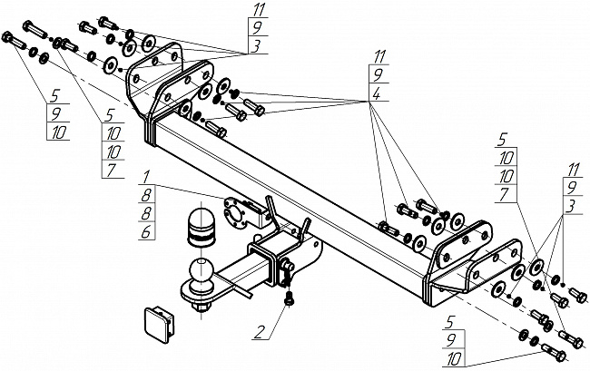 5. Установить вставку с шаром, закрепить её пальцем при помощи шплинта, прикрепить её болтом М10х20 (либо установить заглушку).