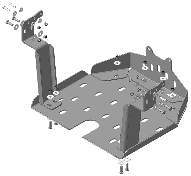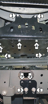 4. Прикрепить щит к кронштейнам (если установлена защита радиатора, то совместно с ней) при помощи болтов М12х40 с шайбами 12 и гайками М12. Затянуть весь крепеж.