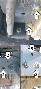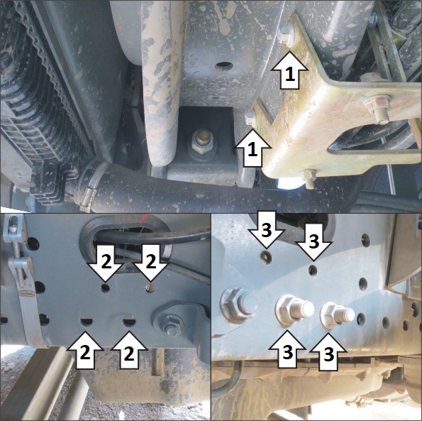 3. Прикрепить задний левый кронштейн в штатные отверстия в раме автомобиля при помощи болтов М10х40 с шайбами 10 и гайками М10 в верхние отверстия кронштейна, либо болтов М12х40 с шайбами 12 и гайками М12 снизу. При наличии штатных болтов для крепления кронштейна можно использовать их.