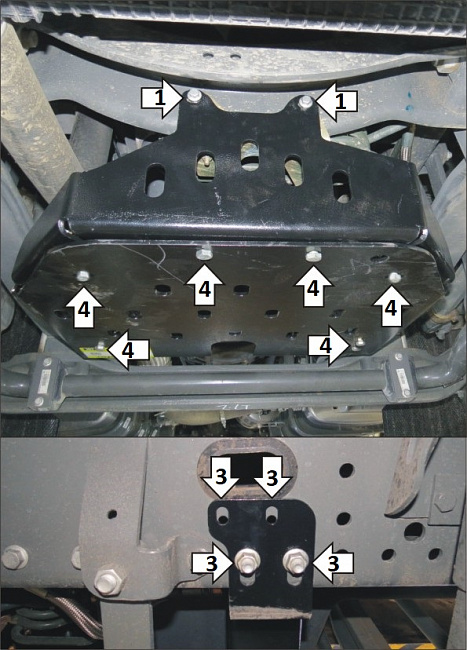 Защиту допускается устанавливать совместно с защитой радитора Motodor арт. 26205. 1. Под штатные болты крепления змеевика компрессора  установить передний кронштейн. Если на автомобиле ранее установлена защита радиатора Motodor, то необходимо отвернуть болты крепления её щита к кронштейну.