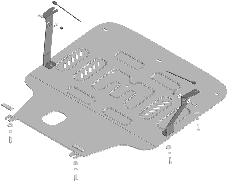 3. В штатные отверстия в подрамнике автомобиля установить задние точки крепления щита защиты при помощи ПР70х20х6 М10, болтов М10х30 с шайбами и гр. шайбами 10.