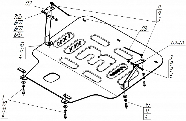 1. В штатные отверстия в лонжеронах автомобиля установить передние кронштейны защиты при помощи специальных закладных планок, а также болтов М8х30 с шайбами и гр. шайбами 8.