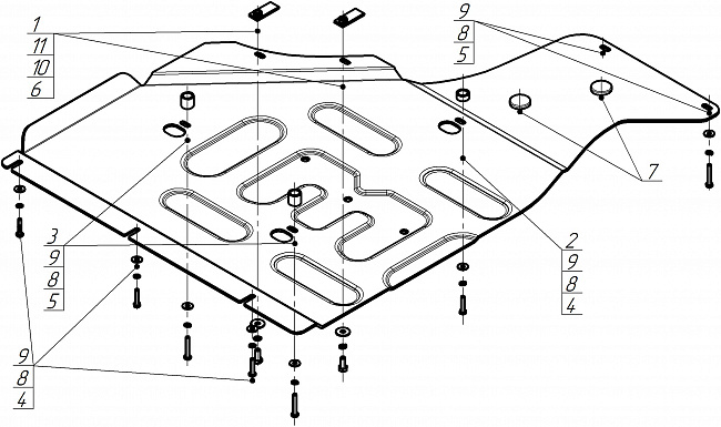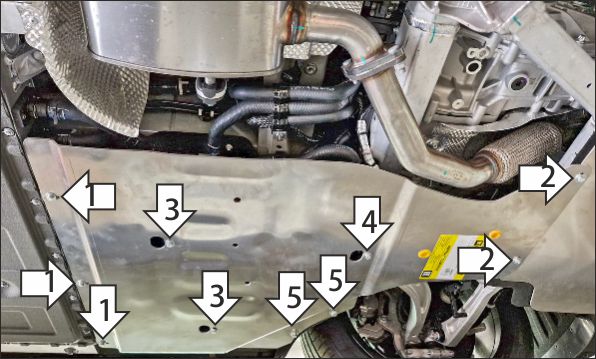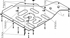 2. В штатные резьбовые отверстия крепления пыльника к подрамнику автомобиля установить передние точки крепления защиты при помощи болтов М6х40 с шайбами и гр. шайбами 6.