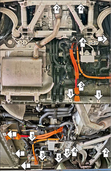 1. В штатные резьбовые отверстия крепления пыльника к поперечине аккумулятора установить задние точки крепления защиты при помощи болтов М6х30 с шайбами и гр. шайбами 6.