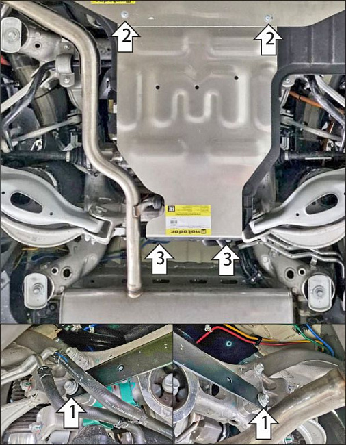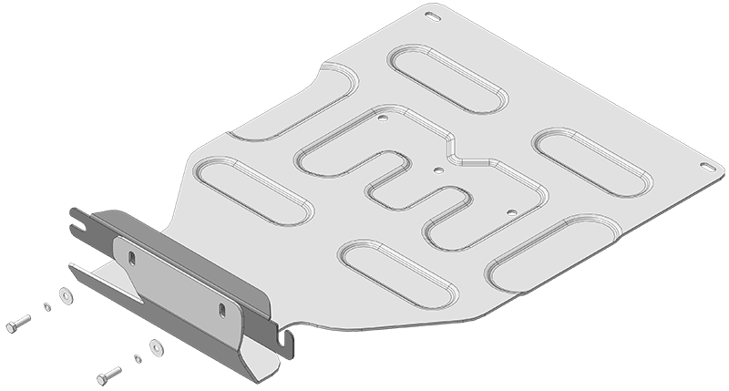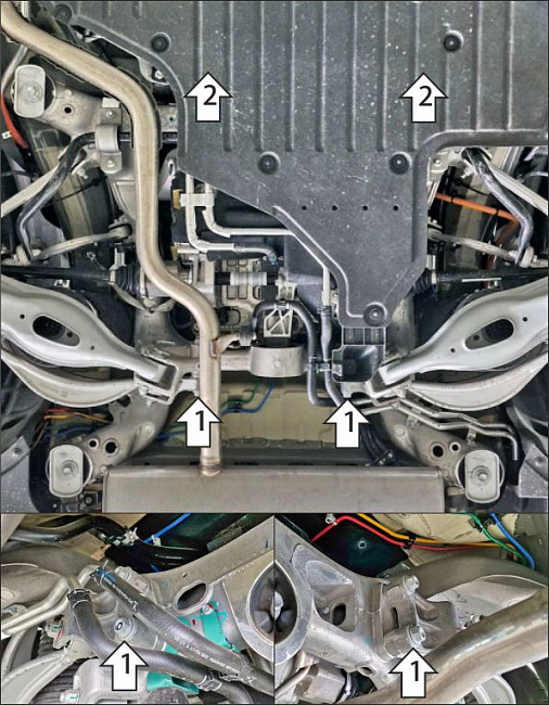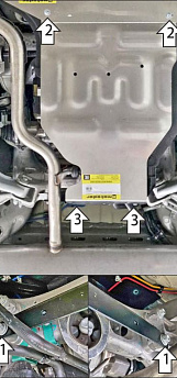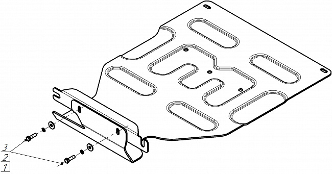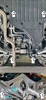 2. К задним кронштейнам защиты арт. 348609 или 348611 (в зависимости от модели автомобиля) прикрепить передние точки щита.