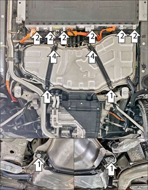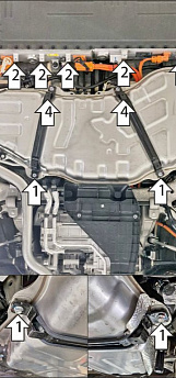 1. Под штатные болты крепления хомутов топливного бака установить кронштейны защиты. Вернуть на место пыльник, предварительно сделав в нём вырезы под кронштейны. Передние болты крепления пыльника и следующие по ходу движения за ними не прикручивать.