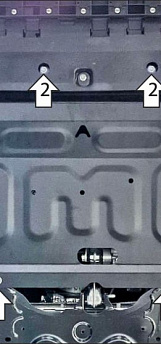 1. В штатные отверстия в подрамнике автомобиля установить задние точки крепления защиты при помощи КЛ 51х20 М8, болтов М8х30 с шайбами и гр. шайбами 8.