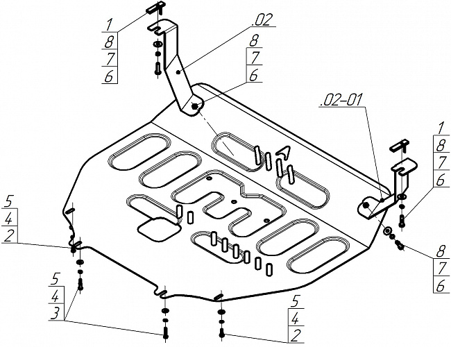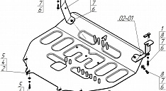 4. В штатные резьбовые отверстия в подрамнике подвески установить средние точки крепления щита при помощи болтов М6х20 с шайбами и гр. шайбами 6. Затянуть весь крепеж с требуемым усилием.