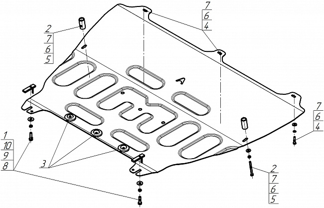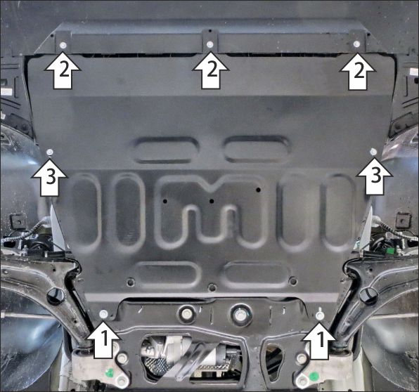 1. Снять штатный пластиковый пыльник. Завести переднюю часть защиты под бампер и установить задние точки крепления защиты в штатные отверстия в подрамнике автомобиля при помощи закладных планок ПУ60х14х6 М8, болтов М8х30 с шайбами и гр. шайбами 8.