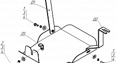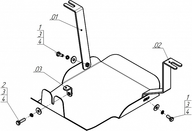 2. В штатное отверстие в подрамнике задней подвески установить заднюю точку крепления защиты при помощи уголка .03, болта М8х30 с шайбой и гр. шайбой 8.