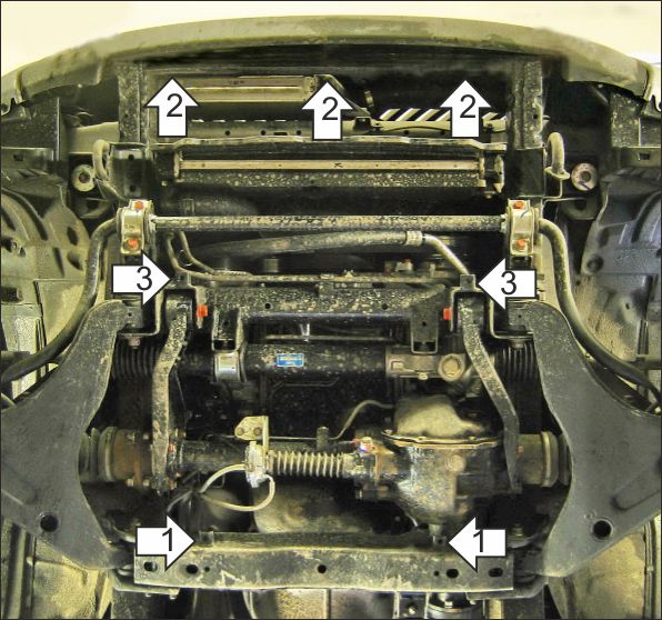 1. Снять штатный пыльник. Установить на заднюю поперечную балку передней подвески задние точки крепления второго щита при помощи болтов М8х20, шайб и гр. шайб 8.