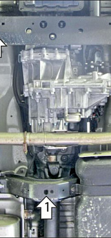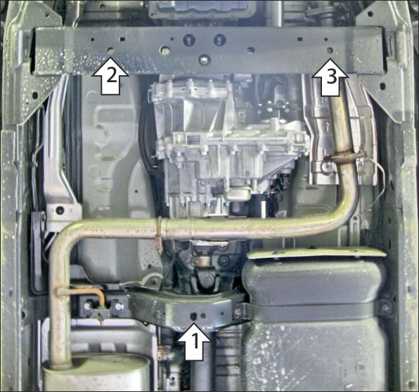 2. В штатное отверстие поперечины установить переднюю правую точку крепления защиты при помощи планки ПЗ 79х20х6 М10 (устанавливается поверх поперечины) и болта М10х70 с шайбой и гр. шайбой 10.