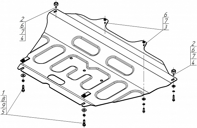 3. В штатные резьбовые отверстия в продольных балках установить средние точки крепления щита при помощи Проставок 10, болтов М6х30 с шайбами и гр. шайбами 6. Затянуть весь крепеж с необходимым усилием.