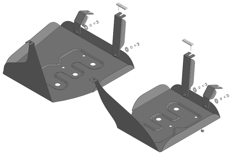 4. Прикрепить щиты к кронштейнам при помощи болтов М8х20 с шайбами и гр. шайбами 8. Затянуть весь крепеж с необходимым усилием.