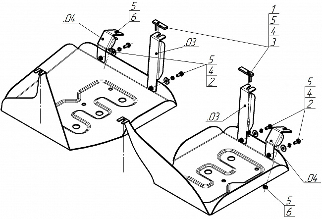 1. Снять резиновые заглушки из штатных отверстий в кузове и установить в них кронштейны 03 при  помощи планок ПУ60х14х6 М8 и болтов М8х30 с шайбами и гр. шайбами 8.