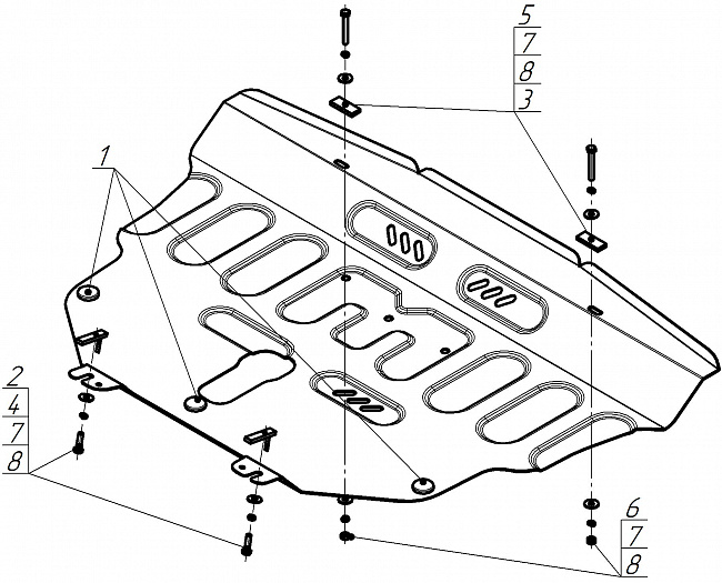 3. Прикрепить к раннее установленным болтам передние точки крепления защиты при помощи гаек М8 с шайбами 8 и гр. шайбами 8. Затянуть весь крепеж с необходимым усилием.