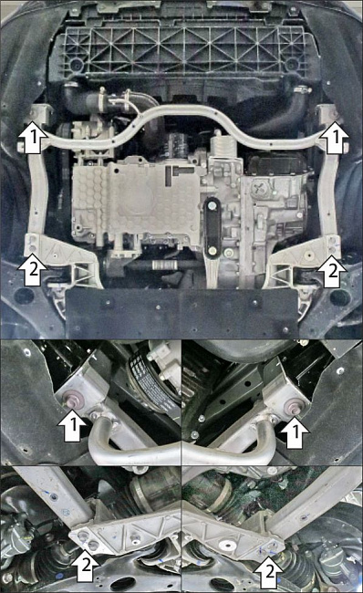 2. Под задние штатные болты, скрепляющие части подрамника, установить задние кронштейны защиты.