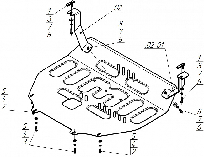 4. В штатные резьбовые отверстия в подрамнике подвески установить средние точки крепления щита при помощи болтов М6х20 с шайбами и гр. шайбами 6. Затянуть весь крепеж с требуемым усилием.