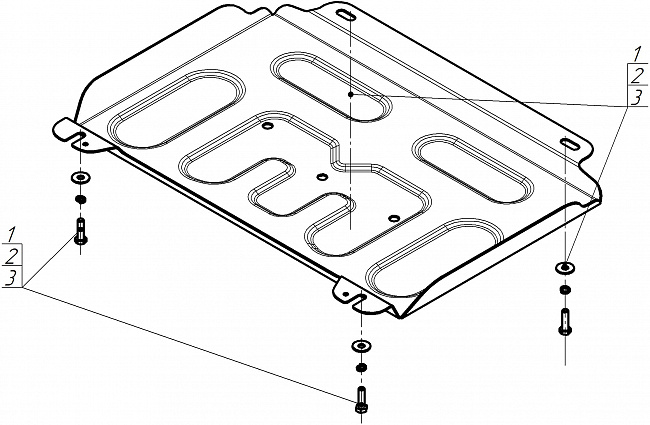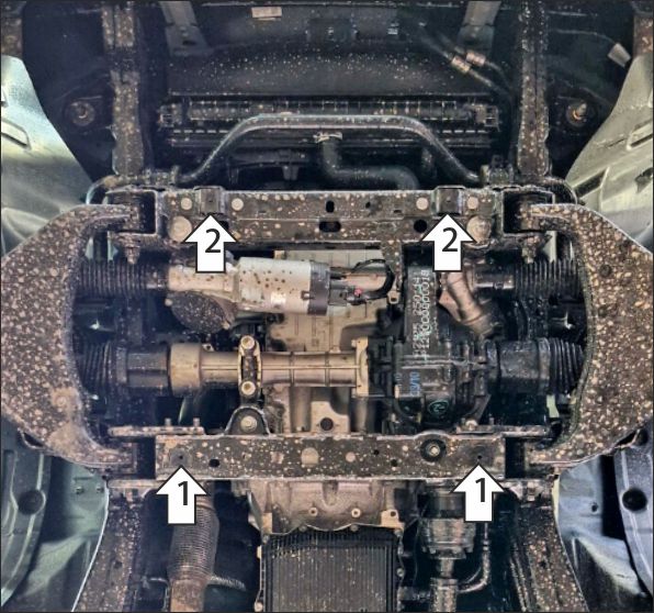 2. В штатные резьбовые отверстия установить передние точки крепления щита при помощи болтов М8х30 с шайбам и гр. шайбами 8. Затянуть весь крепеж с требуемым усилием.