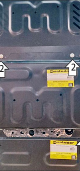 1. В штатные резьбовые отверстия установить задние точки крепления щита при помощи болтов М8х30 с шайбам и гр. шайбами 8.