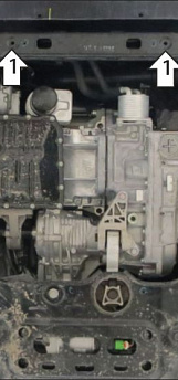 1. Снять штатный пыльник. В штатные отверстия в лонжеронах автомобиля установить кронштейны при помощи закладных планок ПР70х16х6 М10 и болтов М10х30 с шайбами и гр. шайбами 10. В случае установки совместно с пыльником - вернуть его на место, проделав отверстия под болты.
