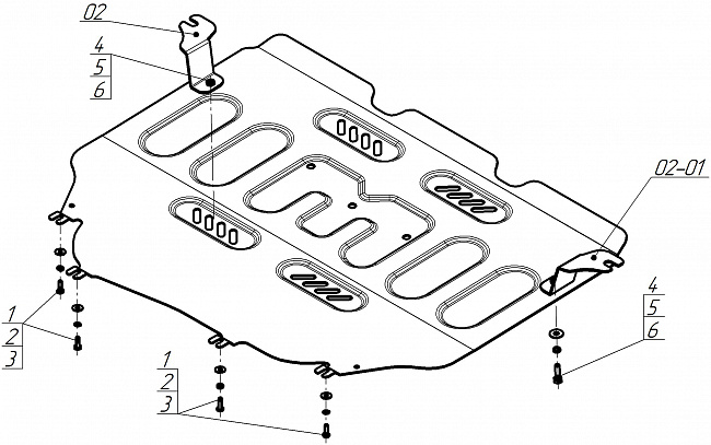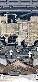 2. В штатные резьбовые отверстия в подрамнике подвески установить задние точки крепления щита при помощи болтов М6х20 с шайбами и гр. шайбами 6.