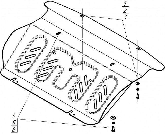 3. В штатные резьбовые отверстия крепления юбки бампера установить передние точки крепления защиты при помощи  болтов М6х20 с шайбам и гр. шайбами 6. Затянуть весь крепеж с требуемым усилием.