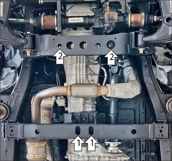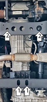 2. В штатные отверстия в поперечине рамы установить передние точки крепления защиты при помощи закладных планок ПР80х20х6 М10 и болтов М10х30 с шайбам и гр. шайбами 10. Затянуть весь крепеж с требуемым усилием.