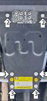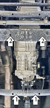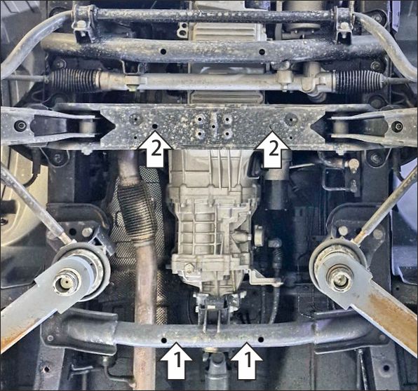 1. Установить скобы крепления защиты на траверсу коробки переключения передач.