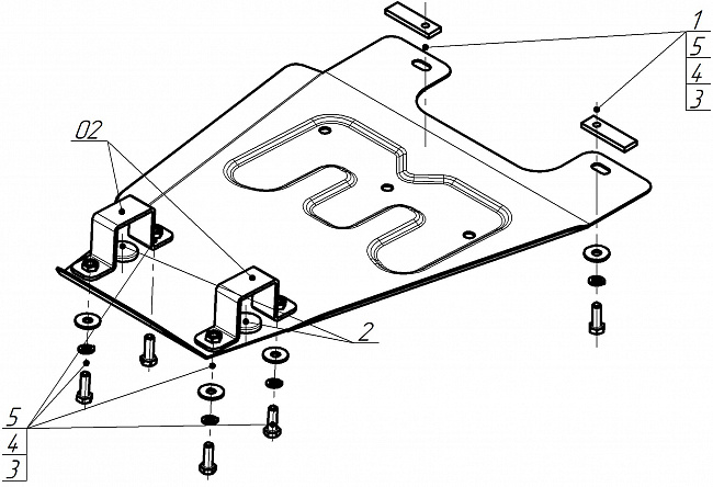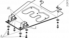2. В штатные отверстия в подрамнике автомобиля установить передние точки крепления защиты при помощи закладных планок ПР70х20х6 М10 и болтов М10х30 с шайбами и гр. шайбами 10.