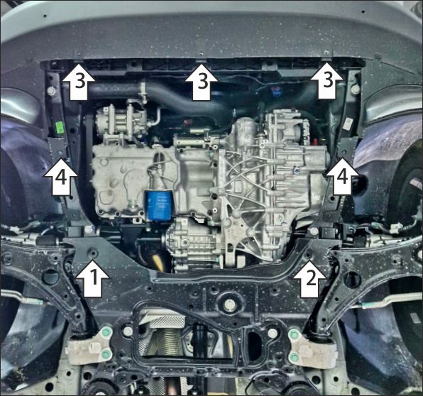 4. В штатные резьбовые отверстия установить средние точки крепления защиты при помощи болтов М6х30, шайб и гр. шайб 6. Затянуть весь крепеж с необходимым усилием.